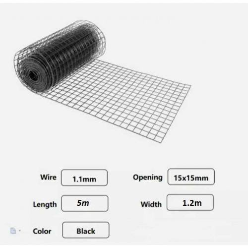 5m x 1200mm roll – 1.1mm Black Gal wire - 15x15mm Holes