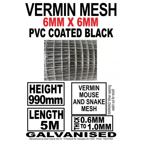 Specifications: - Aperture: 6x6 - Overall Thickness: 0.6-1mm - Height: 990mm - Length: 5m - Material: welded mesh - Coating: PVC Black - Type: Welded - Weight: 4.2kg per roll