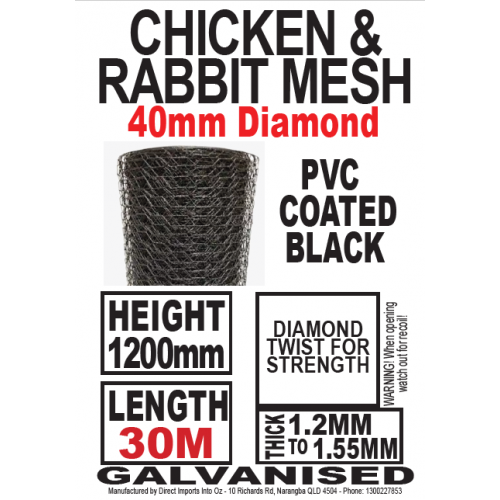 Specifications: - Aperture: 40mm hex opening - Overall Thickness: 1.55mm - Height: 1200mm - Length: 30m - Material: Gal - Coating: PVC Black - Weight: 28kg per roll