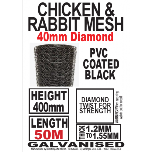50m x 400mm roll – 1.55mm Black Gal wire - 40mm hex opening