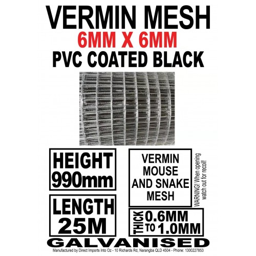 Galvanized Wire Mesh Fencing - Welded then BLACK COATED Direct from the factory warehouse here in Brisbane Our BLACK PVC coated galvanized WIRE mesh roll are an upper-class all-purpose wire mesh fence ideal for pets and animal fences, farm fencing, garden plant protection, and animal enclosure. Ideal for mice, guinea pigs, aviaries for small birds, reptile enclosures, ventilation barriers, fish breeding ponds, crap pots, snake and vermin barriers.