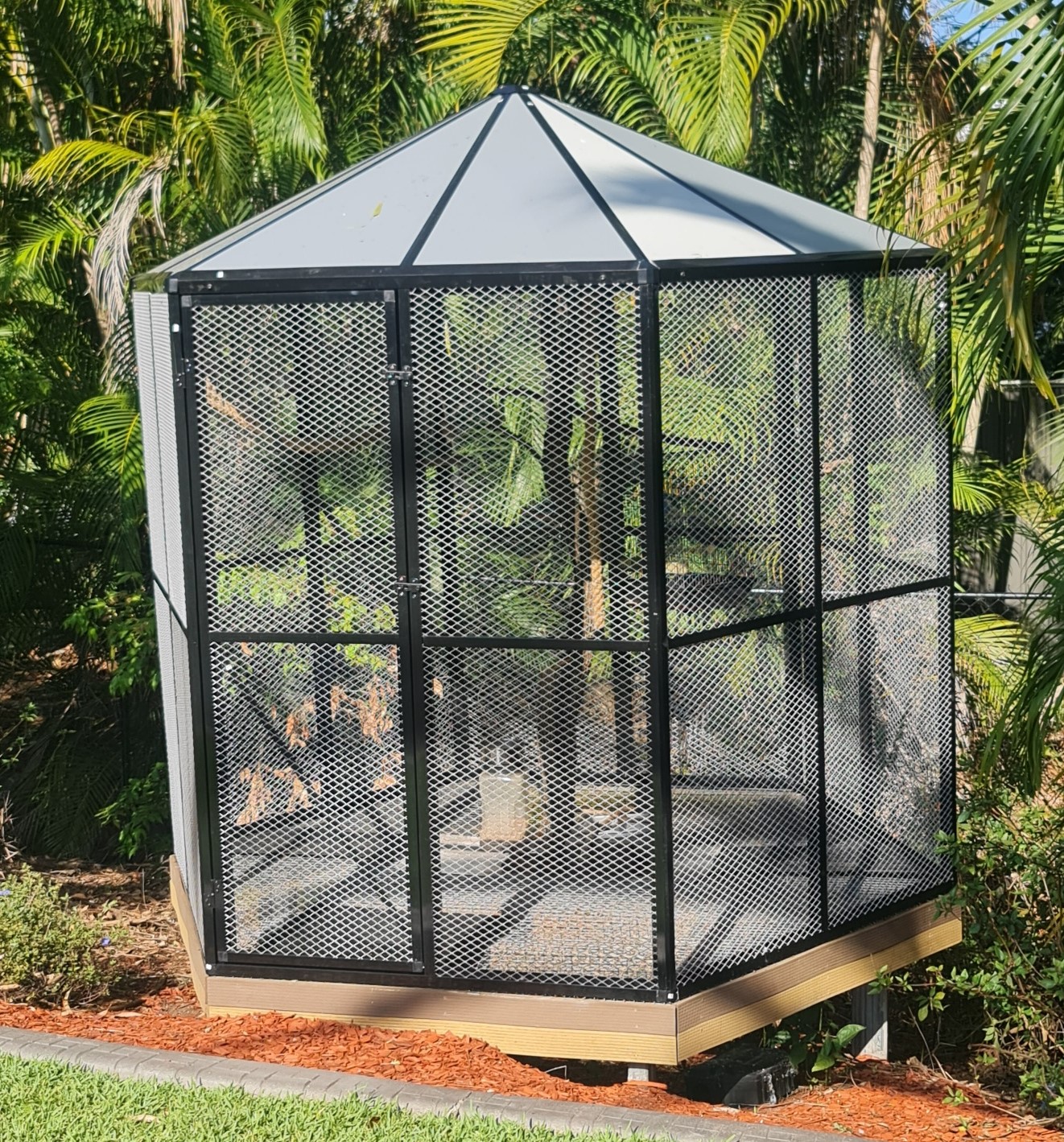 HEXAGONAL BIRD AVIARY - AluminumEXCLUSIVE SUPPLIERWE USUALLY STOCK BOTH THE BLACK AND THE WHITE..White or Black Large Bird Aviary PICKUP Pet Cage Mesh Door Entry Aluminium light weight