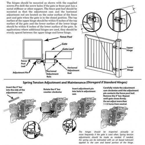 • Self-closing gate hinges: Adjust the spring to a appropriate place, the spring tension is strong enough to achieve your desired smooth self-closing speed. With longer threaded rod adding more adjustability and stability, you can adjust the distance between gate and flanges by a simply nut screwing. The gate hinges can be adjusted from 0.23" - 1.25" gap between the gate post and gate.