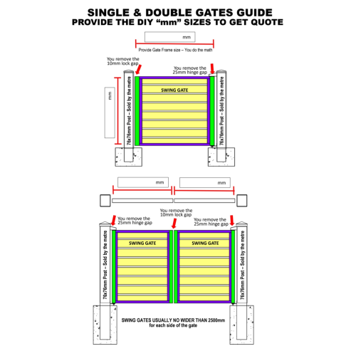 The gate frames are 3 sided and made from 50x50 box with integrated fittings. The security panel cleverly connects inside this frame. Made to suit using our 180degree Pivot Hinges and any of my locks or latches at an extra charge.