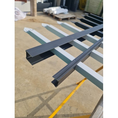 The multi-purpose  top and bottom rail that we have developed have holes pre-punched every 95mm to give you a prefect vertical fence system that you can do DIY in any width or height that your job requires.  The 2 rails screws to the bars and fully concealed behind a locked in alloy cover.  Security strong and no screws showing with a great looking finish.