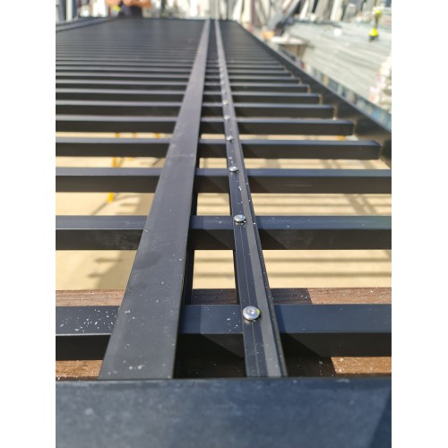 The security bars are 25mm x 25mm and 1.2mm thick powder coated aluminum. The horizontal rails can be mounted anywhere you like on the bars to allow attaching to your frame easy.