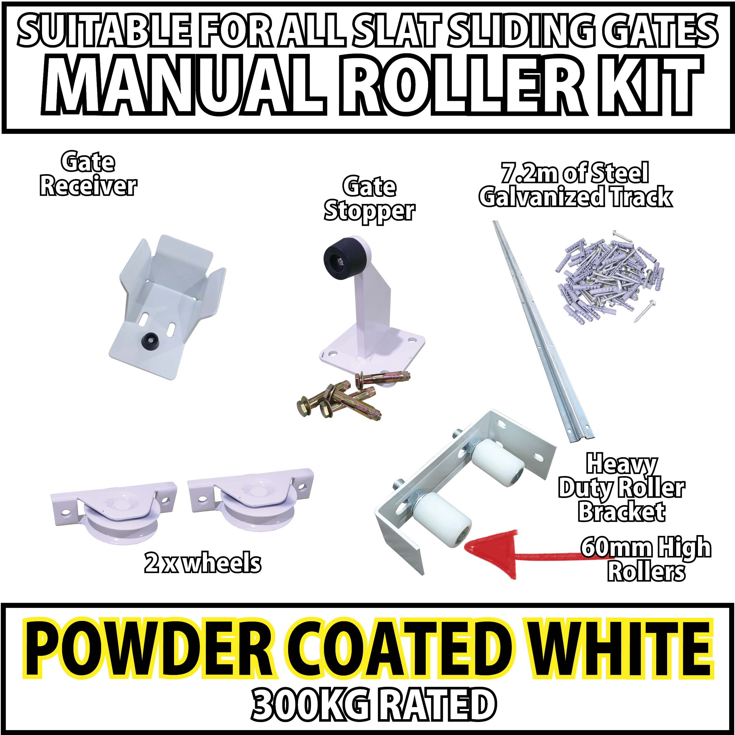 Everything needed to Operate your Sliding Gate ManuallyPOWDER COATED IN WHITEThe kit comes with:&nbs..Slat Sliding Gate Track - Extra metres only - MUST BUY ROLLER KIT AS WELL