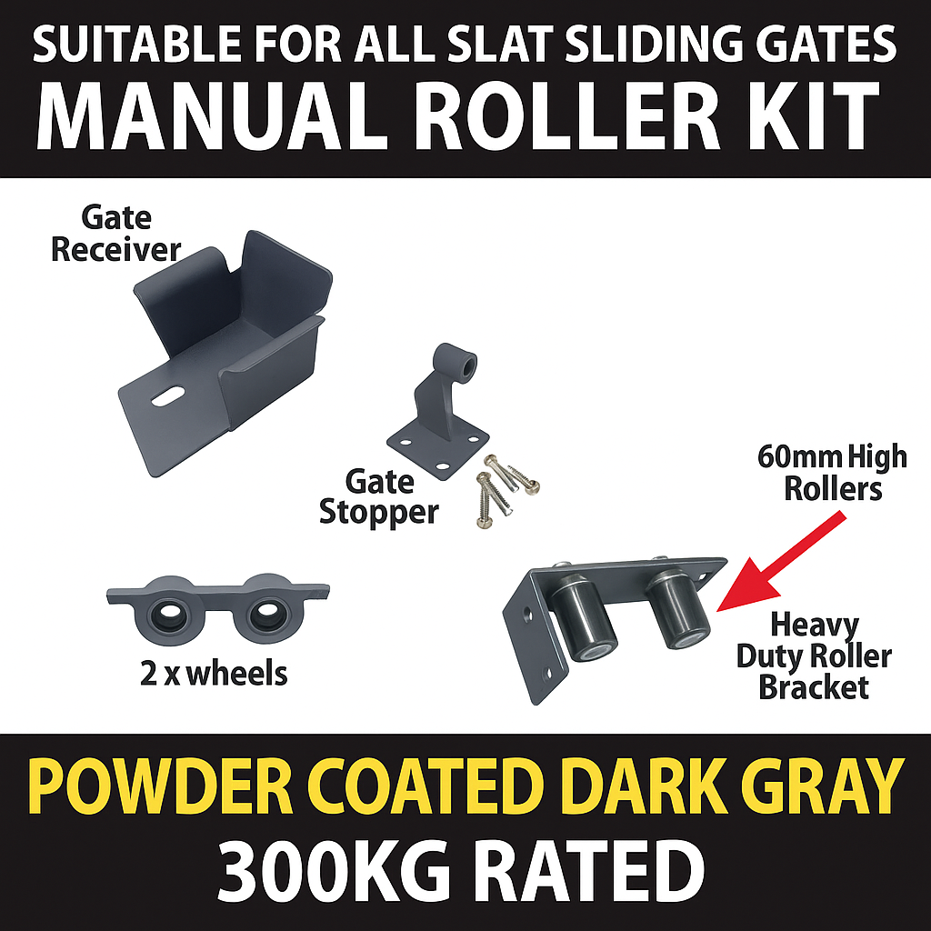 Everything needed to Operate your Sliding Gate ManuallyPOWDER COATED IN DARK GREYThe kit comes with:..Slat Sliding Gate Roller Kit - White and 7m Track