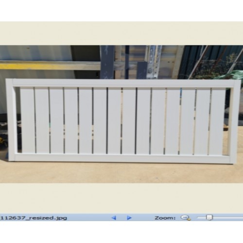 The listed price is an estimate of vertical Sliding Gate in Gloss white per Square Metre at 5000w x 1730h with an 110mm x 50mm top and bottom Rail with 40mm gaps between the slats. Supplied cut to size then you DIY.