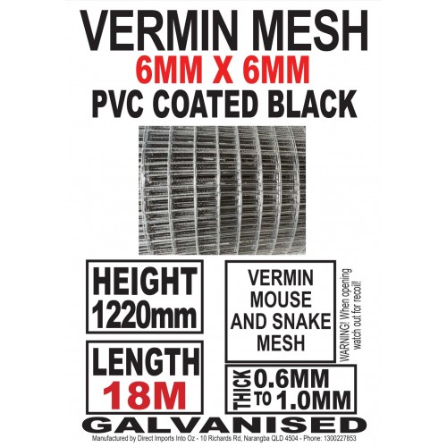 Galvanized Wire Mesh Fencing - Welded then BLACK COATED Direct from the factory warehouse here in Brisbane Our BLACK PVC coated galvanized WIRE mesh roll are an upper-class all-purpose wire mesh fence ideal for pets and animal fences, farm fencing, garden plant protection, and animal enclosure. Ideal for mice, guinea pigs, aviaries for small birds, reptile enclosures, ventilation barriers, fish breeding ponds, crap pots, snake and vermin barriers.